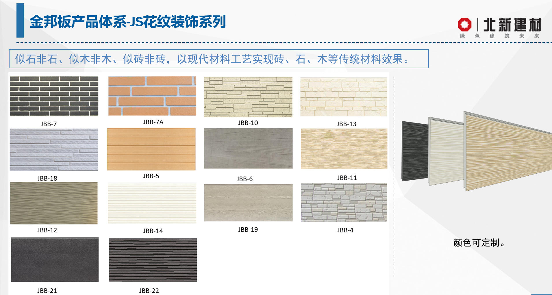 北新建材金邦板为纤维水泥外墙装饰板,采用水泥基材复合纤维增强技术制成,具有耐候性强、稳定性好、装饰效果丰富等特点。产品适用于各类公共建筑及外立面工程,支持干挂施工,满足多样化设计需求。该体系源于引进日本成熟技术,已在多个重点工程项目中得到应用,具备良好的工程实践基础与应用经验。